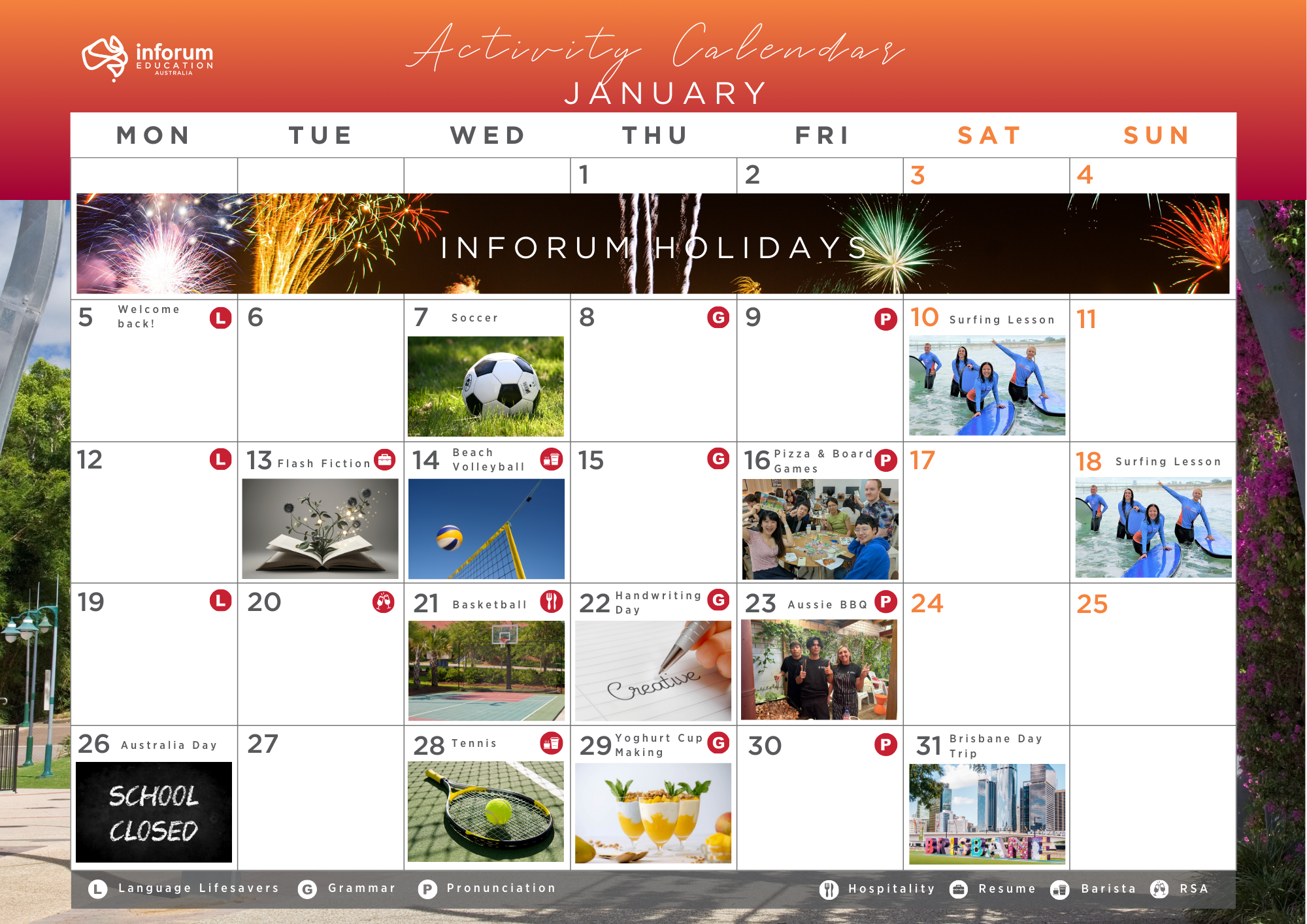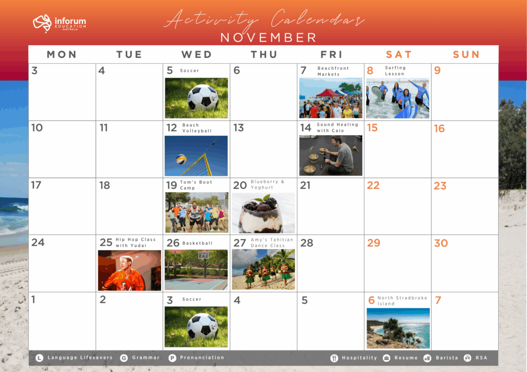 こちらの学校は、ご夫婦経営のとってもアットホームな学校です。学生さんの人数も多くなく、サポートが隅々まで行き届いています。常に学生さんたちからの評価も高い学校です。ゴールドコーストへの留学をお考えの方、是非Inforum校を候補に入れてみてくださいね。