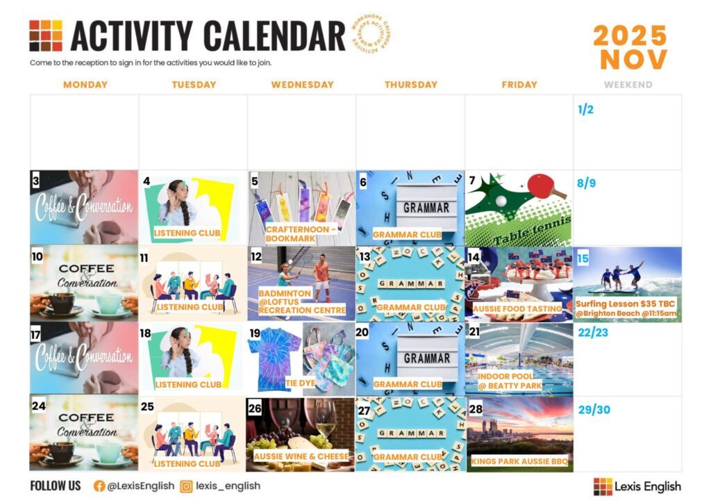 レクシスパースシティではアクティビティを提供しています。英会話を伸ばしたい方向けの会話クラブや仕事探しに役立つ履歴書・面接ワークショップなども行っていますので、英語の上達だけでなく生活に役立つサポートも充実しています。