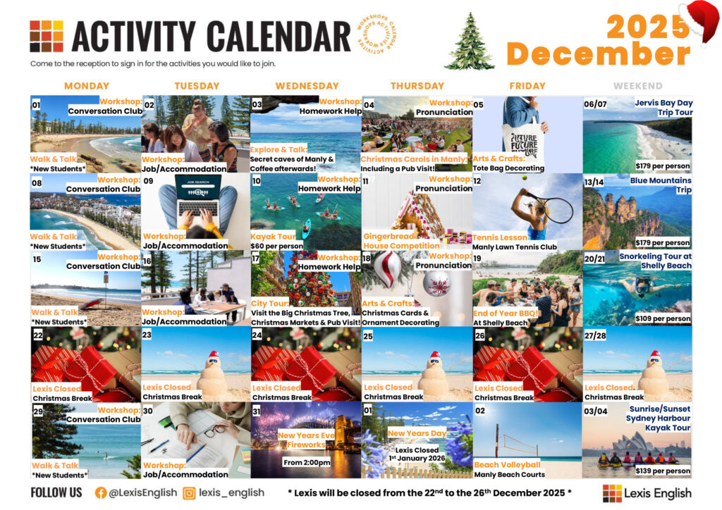 会話や文法、発音などアカデミックなアクティビティから、仕事探しサポート、ビーチバレーやアートギャラリー訪問など盛りだくさんです。