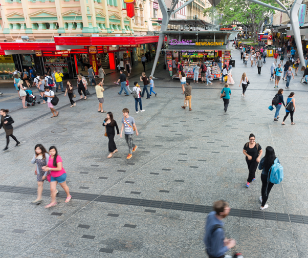 ブリスベン中心部には、全長約500メートルにわたる歩行者専用エリア「クイーンストリートモール」があります。ここは地元の人々から観光客まで多くの人で賑わうショッピングストリートで、百貨店やブティック、土産物店、レストランが立ち並びます。