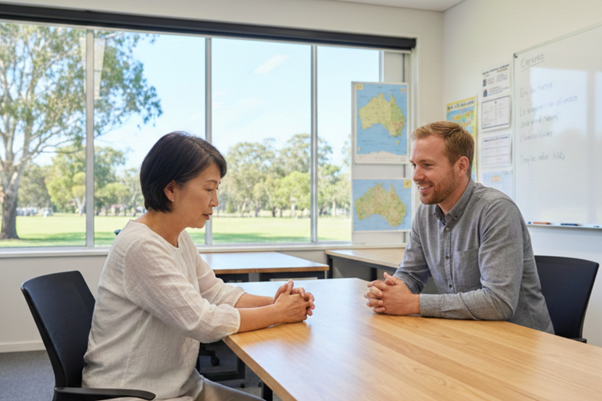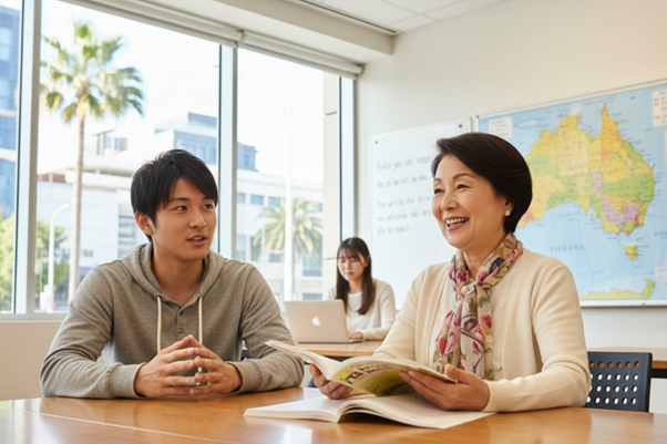 語学学校では、たとえばランゲージエクスチェンジといって、日本文化や日本語に興味のあるオーストラリア人学生と語学学校の生徒がペアを組み、互いに英語と日本語を教え合う取り組みがよく行われています。
